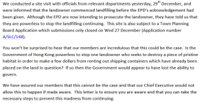 And despite the video evidence in its possession the EPD has been unwilling to use its powers to pursue and arrest the fly-tippers or to order a stop to the landfilling.